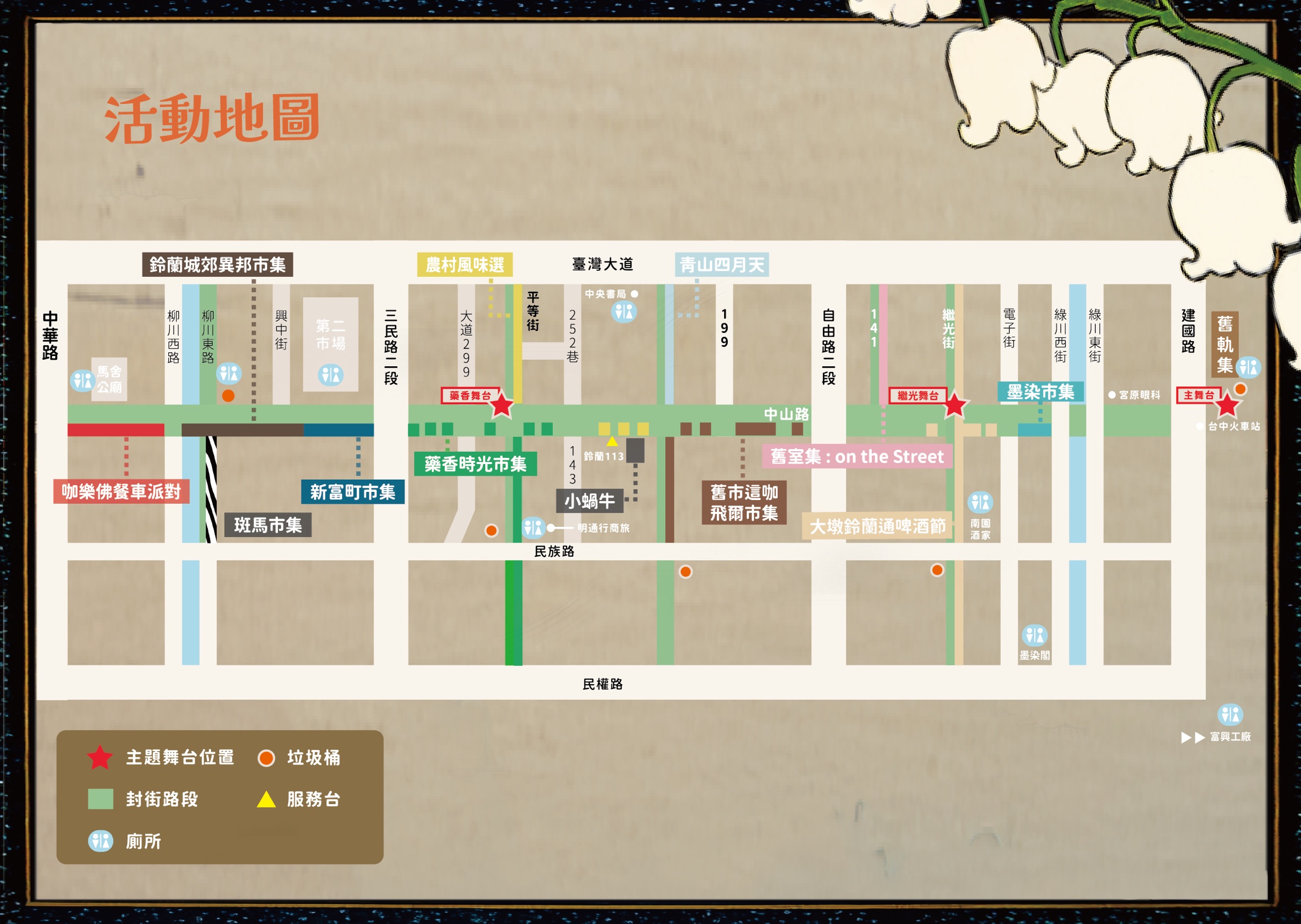 【協辦單位】遊牧人 The Nomad (傳統射箭/原野射箭/戶外生活/larp) 逢甲傳統射箭Fcu traditional archery club、大台中中藥商業同業公會、彰化縣中藥商業同業公會、南投縣中藥商業同業公會、明通製藥股份有限公司、中醫藥學會、中國醫藥大學立夫中醫藥博物館、永裕行、 一秋刀劍、沉溺出租-漢服古風體驗工作室、萬縷紡、雙夏、凝聚舞團、玖樂舞團、臺中Jōzō、緁出點子企劃室、臻里創意開發有限公司、孵地有限公司、玩得瘋SAX重奏團、大洞敦史、晴空舞蹈訓練館、鼓創藝術、台中市醫師音樂協會流行人聲樂團、時花大製作、蘿拉舞蹈工作室、有你薩克斯風、沃 佛朗明哥工作室、中西爵士大樂團、蝶舞舞團、點點狂響曲、1388 醫生爸爸樂團、鐵漢堡騎士團 The Knights of Ironburg、LARP 中古世紀實境遊戲、伊諾斯維 Eynosva LARP、武魂擊-台灣甲冑武士隊、台灣戰國武士魂、梅迪耶修會OrdoMediare、羅馬高雄人、Let’s Swing Taichung 台中搖擺舞教室、中興西服冰菓室、小鍋甜點咖啡、喫茶月滿 · 月滿小書店、臻品筆墨莊 Cherish Pen、綻Zhan咖啡|琴酒&Tonic|、覓靚mijin、潮返書店、Lily’s 起司雜貨、春芳號台中城中店(全球總店)、Teatop第一味台中站前店、天天烘焙、與魚咖啡、中央書局、新藍天旅棧 BlueSky Hotel、丸文食品光復店、瑞成書局、太陽堂老店25號、小草花舍花藝工作室、黑橋牌自由門市、陳允寶泉、無敵咖啡、屋籽 uzupiz 設計選物、鈴蘭133、悅樂旅店附設 OLAH Cafe、李方艾美酒店、墨染閣古風寫真攝影、富興工廠1962、島島永續柑仔店、溦妙雜貨店、財團法人台中市順天宮輔順將軍廟、楊文宏里長、吳禎耀里長、邱婉玲里長、張富星里長、張文華里長、蔡翠碧里長、林志隆里長、廖榮中里長、臺中市西區大同國民小學、臺中市中區光復國民小學